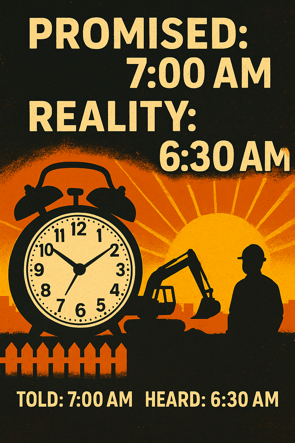 Start times would be maintained at 7:00 AM. But the reality has been rumble-up by 6:30 AM: backup beepers, engines, metal clanks...the whole pre-dawn soundtrack.
