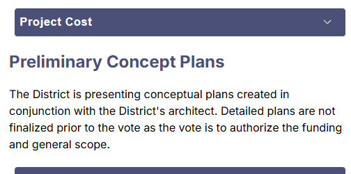 "The District is presenting conceptual plans created in conjunction with the District's architect. Detailed plans are not finalized prior to the vote as the vote is to authorize the funding and general scope."